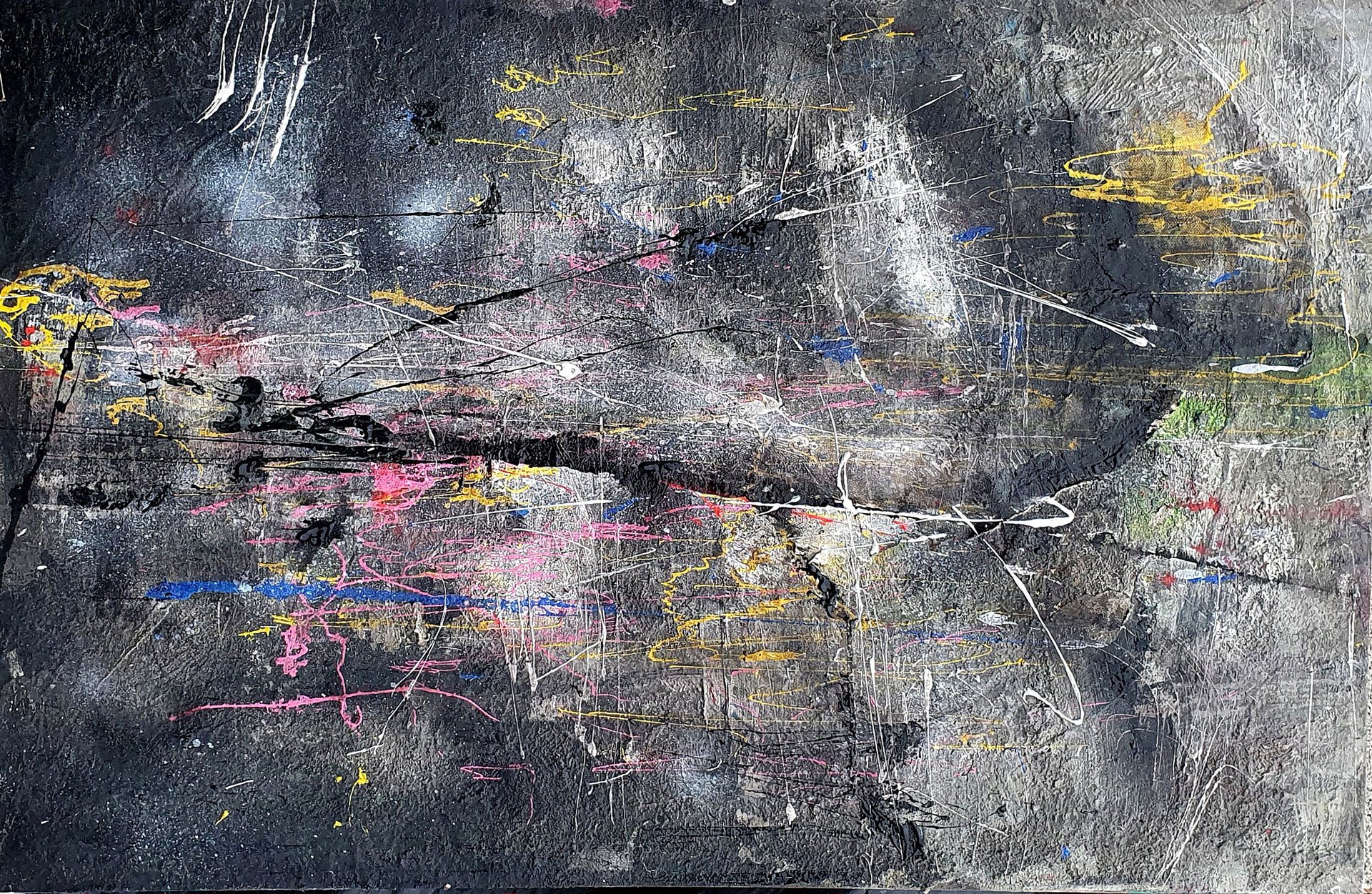 Dieses großformatige Originalkunstwerk (140 x 70 cm, Mixed Media auf Leinwand) vereint expressive Gestik mit einer faszinierenden Farbvielfalt. Wirbelnde Linien in Schwarz und Weiß treffen auf lebendige Akzente in Blau, Rot, Gelb und Grün. Die vielschichtige, spontane Malweise und die sichtbare Textur verleihen dem Bild eine außergewöhnliche Tiefe und Dynamik.