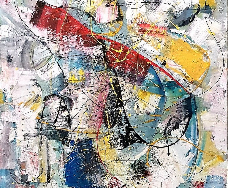 Die expressiven Farben und energiegeladenen Linien laden den Betrachter ein, in eine Welt der puren Emotion einzutauchen und eigene Assoziationen zu entwickeln. Die gestische Malweise, die expressive Farbgebung und die Betonung der Materialität erinnern an die Kunst der Informel (z.B. Künstler wie Jean Fautrier, Hans Hartung, Wols). Die dynamische Komposition, die kraftvollen Pinselstriche und die Verwendung von Schwarz als dominanter Farbe könnten auf Einflüsse des Abstrakten Expressionismus hindeuten (z.B. Künstler wie Jackson Pollock, Franz Kline, Willem de Kooning).